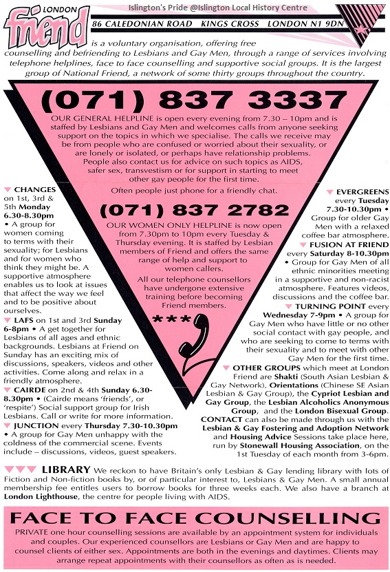 Scope and ContentLeaflet about London Friend and the services, activities, social groups and support they provide or are held on the London Friend premises.