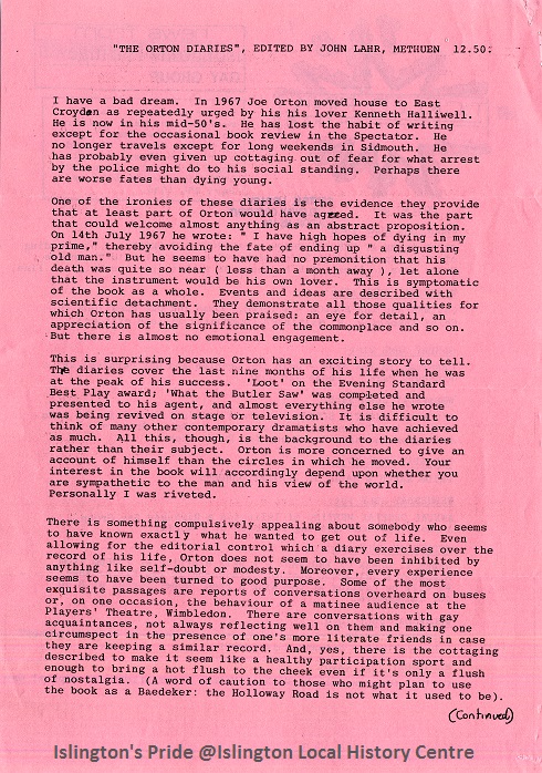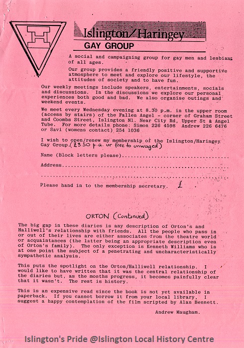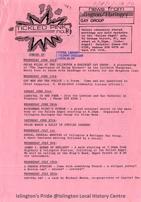Scope and ContentIslington and Haringey Gay Group newsletter, Tickled Pink No. 8, includes events taking place 10th June to 22nd July and a review of 'The Orton Diaries' edited by John Lahr.
