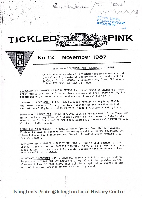Scope and ContentIslington and Haringey Gay Group newsletter, Tickled Pink No. 12, containing details for Group meeting at the Fallen Angel Pub and events taking place 4th November to 2nd December.