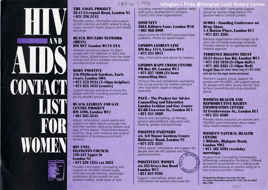 Scope and ContentFlyer produced by Islington Council HIV Unit providing a list of contacts for women in relation to HIV/AIDS for information, advice, support, etc.