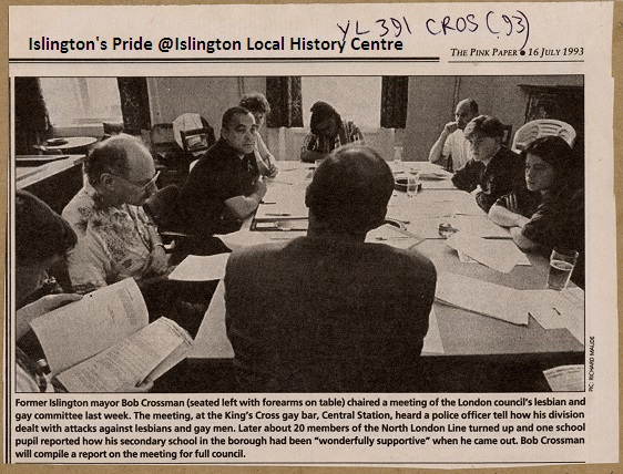 Scope and ContentNewspaper cutting regarding Bob Crossman chairing a meeting of the London council's lesbian and gay committee at Central Station including the police division dealing with attacks against gay men and lesbians, and North London Line.
