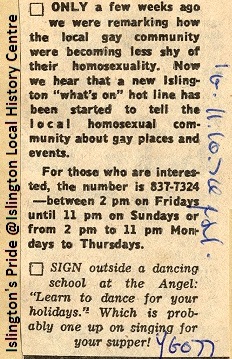 Scope and ContentNewspaper cutting regarding a new Islington "what's on" hot line for gay places and events.