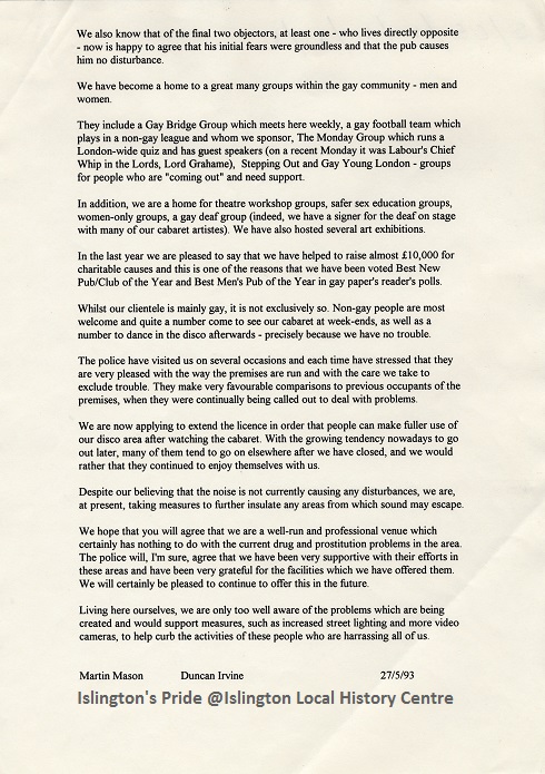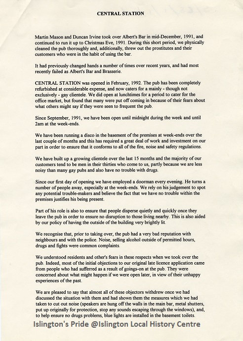 Scope and Content2 A4 pages containing a brief review of the pub's activities since the pub was taken over by Mason and Irvine in 1991, including actions taken to create a more secure and respectable venue, groups that meet at the pub and future plans.