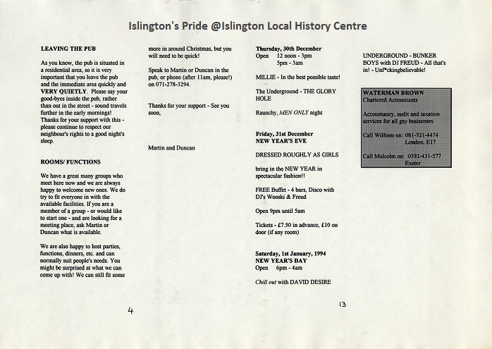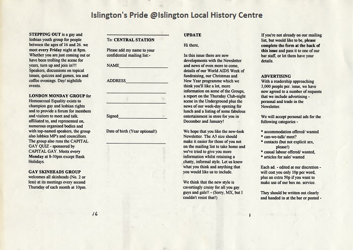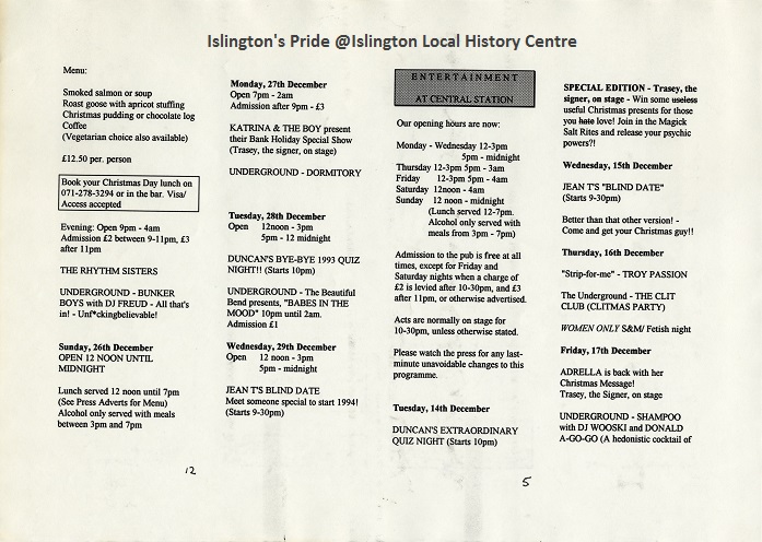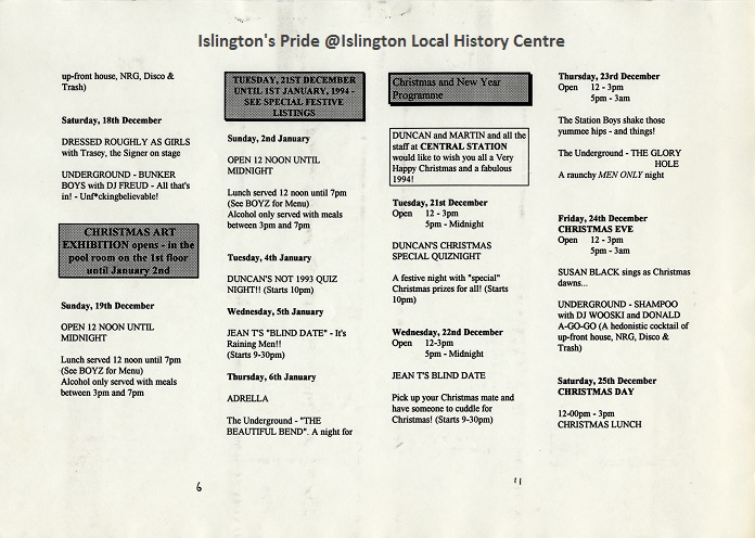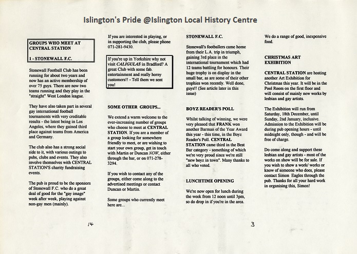 Scope and ContentCentral Station newsletter No. 13 print copy, including information regarding advertising, World AIDS Day, the Christmas/ New Year programme, Stonewall FC, Boyz reader's poll and the Christmas art exhibition. Also contains a programme of events and activities as well as a list of groups that meet at Central Station. Contains provocative language.