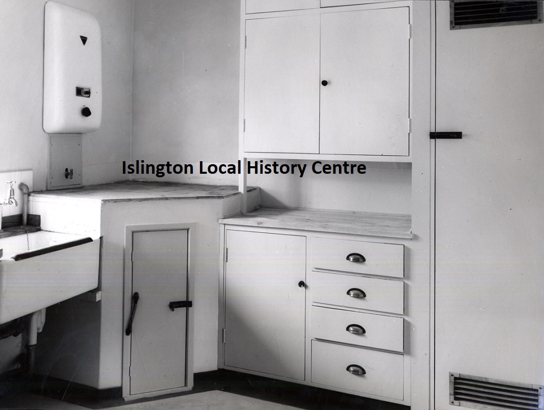 Scope and ContentHolly Park Estate interior showing the corner of a typical kitchen with built in cupboard and drawers.