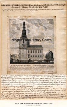 'The South view of Islington Church & Steeple with the Scaffolding & Wicker-work' while the Church, Tower & Spire were under a thorough Reparation. Extensive printed caption.