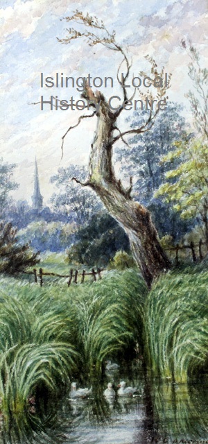 Watercolour depicts three ducks in a water and woodland setting with church spire in the distance, possibly St Mary's Church, Upper Street