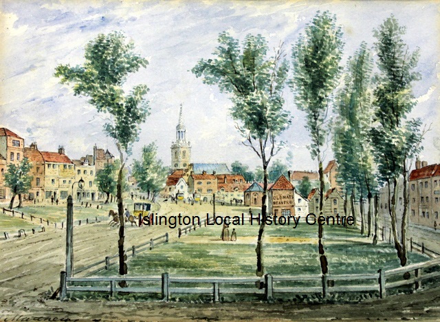 Upper Street looking North towards St Mary's church across Islington Green and the parish lock-up, on the right Islington High Street