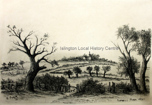 Rural scene depicting Tufnell Park as open fields with St Michael's Church, Highgate (Camden) in the distance