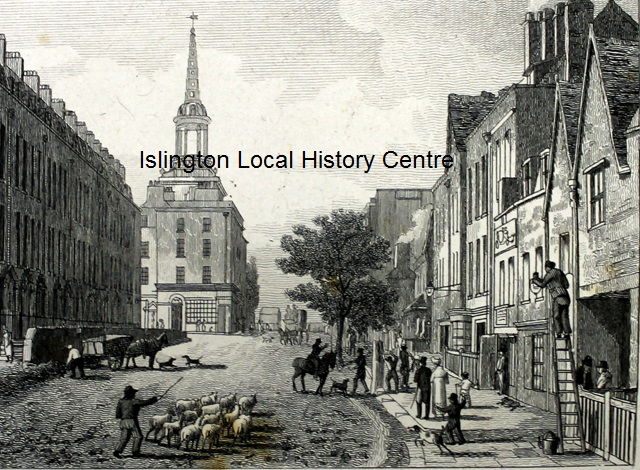 Scene of Upper Street featuring pedestrians, lamp lighters, sheep and sheep drovers and St Mary's Parish Church in Upper Street