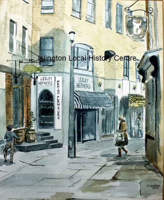 Camden Passage showing Lesley Hepherd's antique shop and a single shopper.