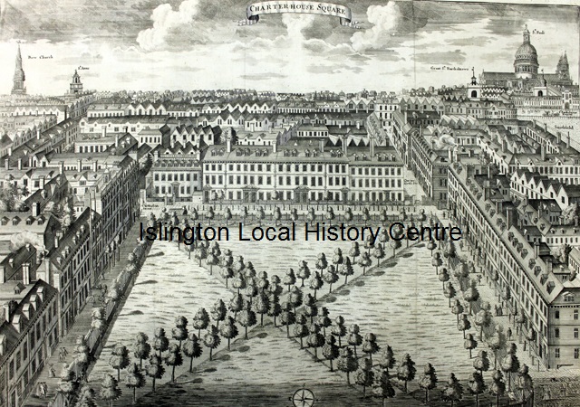 View of Charterhouse buildings with Bow church, Great St Bartholomew and St Paul's Cathedral in the background.