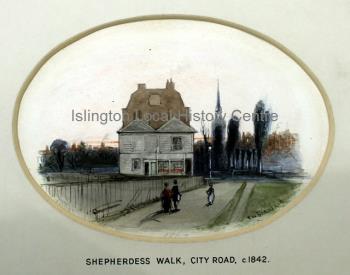Shepherdess Walk (London Borough of Hackney), off City Road in the evening with pedestrians.