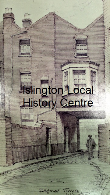 Copy print of drawing looking along alley through archway to Cross Street.