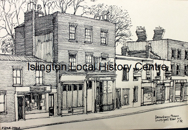 Pen and ink drawing of 196 Liverpool Road (just North of Gibson Square) where free legal advice was offered.