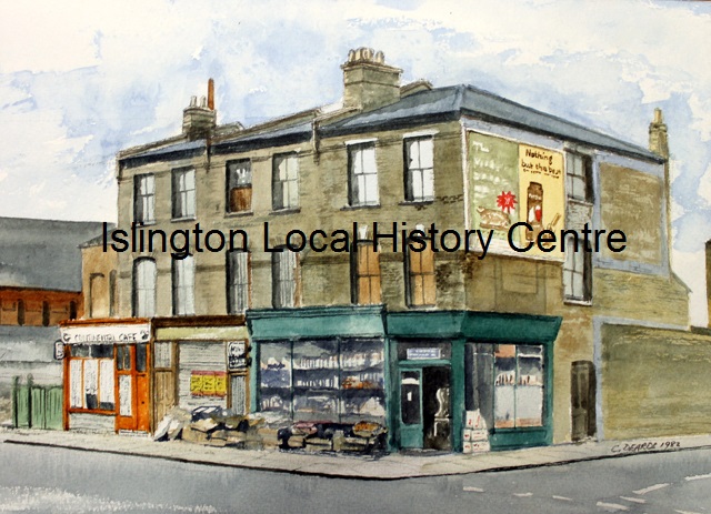 Row of shops along Hornsey Road at the corner with Mayton Street.