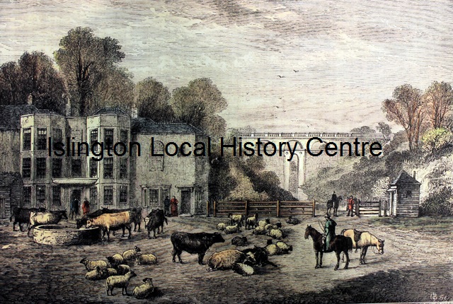 Rural scene of 'Highgate' Archway looking North (designed by John Nash and opened in 1813) with cattle and sheep.