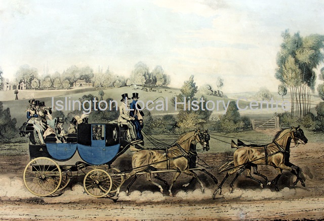 Stage coach and passengers in open country.