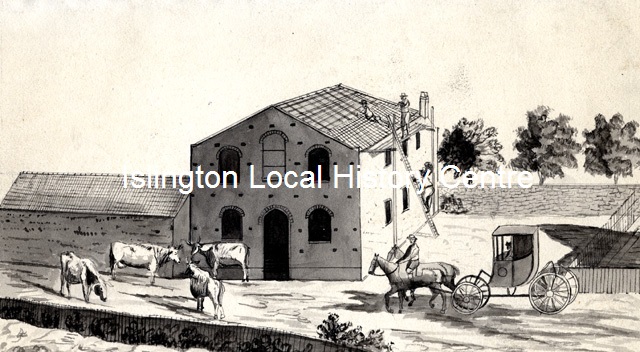 Old Islington Chapel, Church Street (now Gaskin Street), Islington. Drawing features building workers on ladders, horses and carriage and four cattle