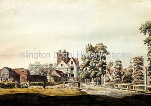 Rural view of the tower from a bridge with the wall still in place (demolished 1776-1780 for Canonbury Place)
