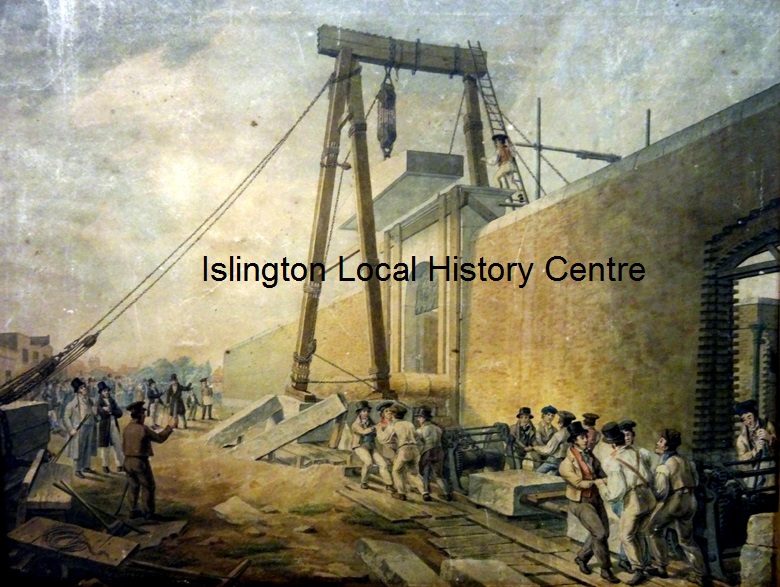 Charles Barry, who designed the House of Parliament, designed the gateway to Pentonville Prison ('gratuitously' according to the mount), here being constructed by workmen using pulleys and hoists, watched by an interested crowd.