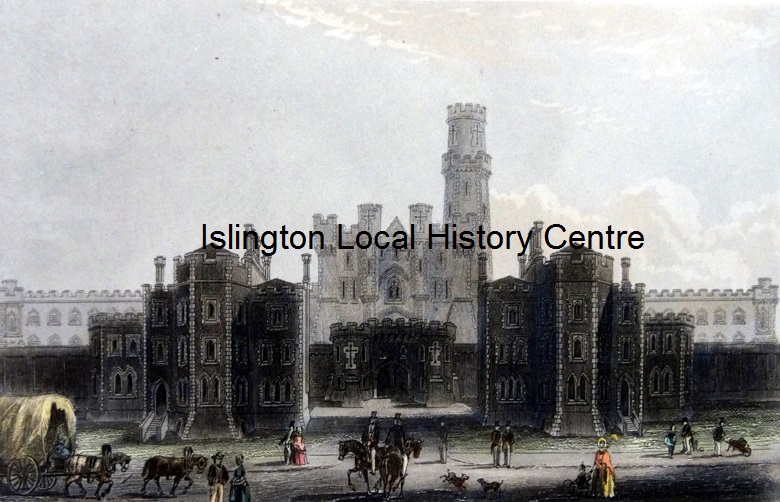 Busy Victorian scene outside the entrance to Holloway Prison which was built 1848-52 to designs by James Bunning, architect of the Metropolitan Cattle Market, who modelled it on Warwick Castle.