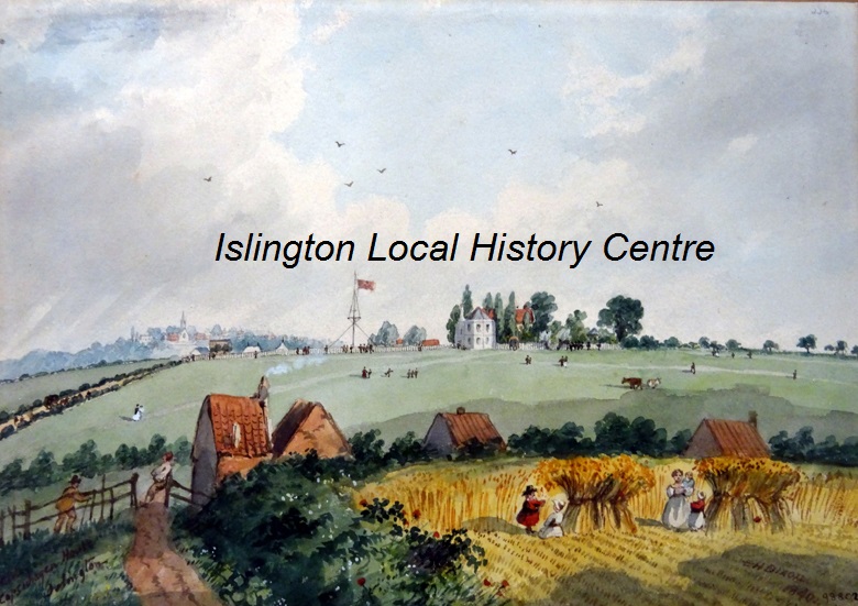 - NotesSigned and dated 1840. Handwritten caption glued to back, presumably added later by artist (c.1870?) 'View of Old Copenhagen House, Islington. The House stood on the spot now occupied by the Clock Tower of the New Cattle Market. The Maiden Lane on the left (now the York Road) Mawes & Sorgons (?) Floor Cloth Factory (the present Brecknock Arms) Highgate Church in the distance. View taken from the Frenchmans Island'.