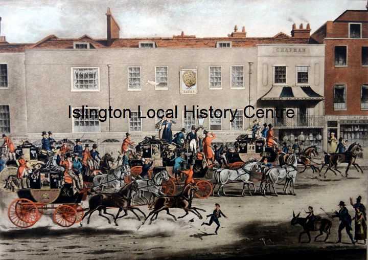 Late Georgian busy street scene with coaches full of passengers at the Angel (Islington High Street, West side)