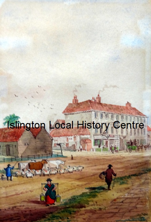 Later representation of rural scene at the Angel before New Road (later Pentonville Road) became a major transport hub