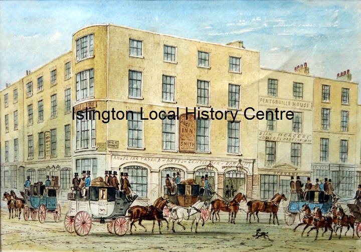 Early Victorian Angel street scene when New Road (later Pentonville Road) had become a major transport hub.