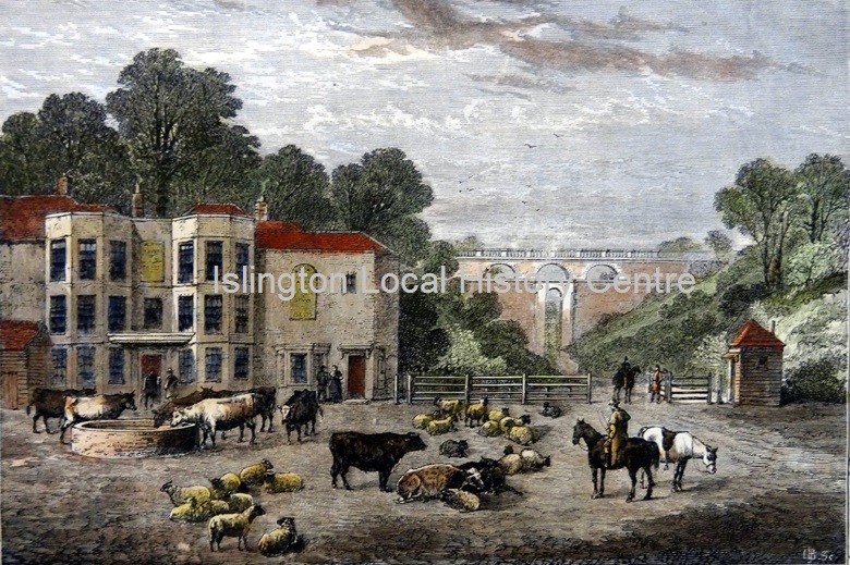 Rural scene of 'Highgate' Archway looking North (designed by John Nash and opened in 1813) with cattle and sheep.