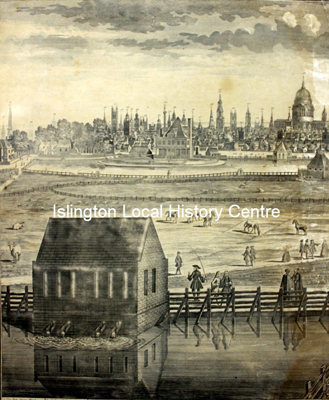 View over the reservoirs at the New River at Islington towards the City of London with St Paul's on the right and Saddler's Wells in the centre, including some animals and people. 'The House which supplies the New Pond' is in the foreground.
