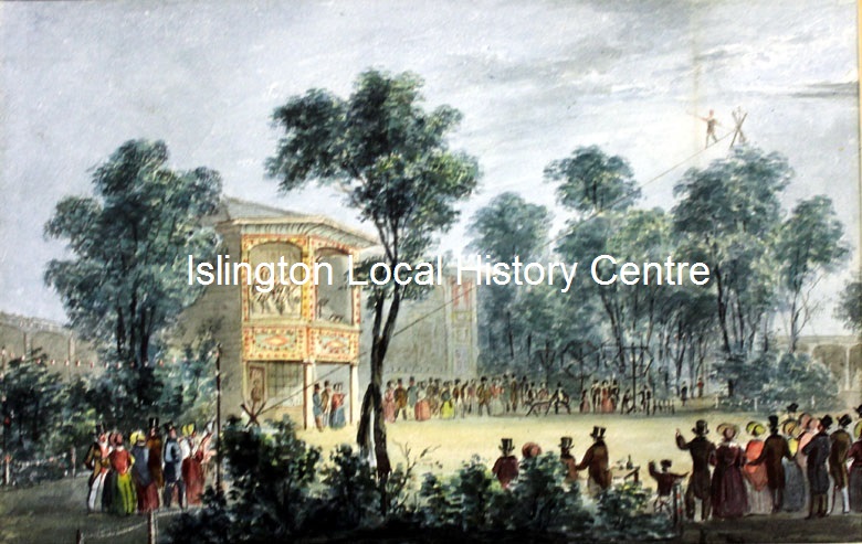 A crowd watching a tight-rope walker at White Conduit pleasure gardens on a summer evening