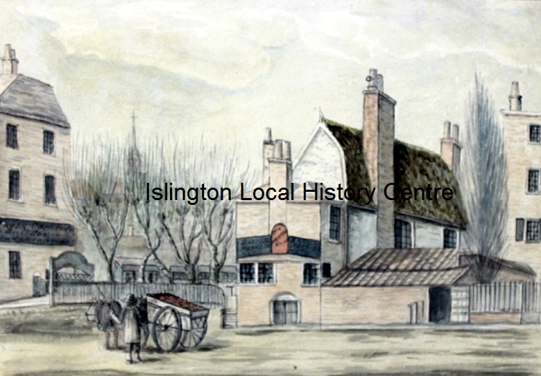 Quiet scene with a cart outside this inn, nicknamed 'Job's House' (destroyed by fire 1829) and signs including one for builders