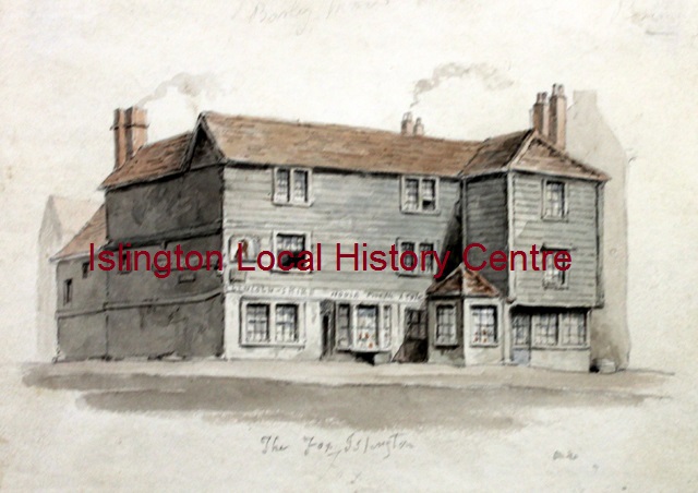 The Fox at Islington Green (North West corner). This is an ancient wooden structure with signs referring to Lincolnshire House and A. Cole (proprietor?)