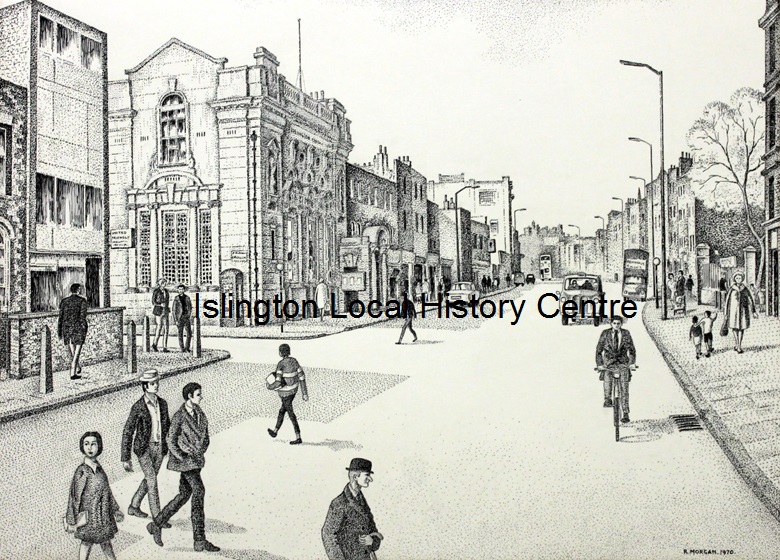 Holloway Road street scene by Islington Central Library, in stippled pen and ink.