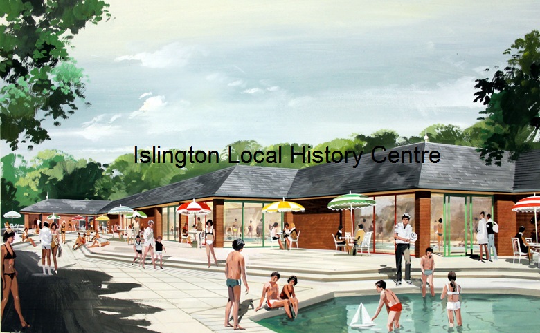Busy poolside scene at new Highbury Fields swimming pool