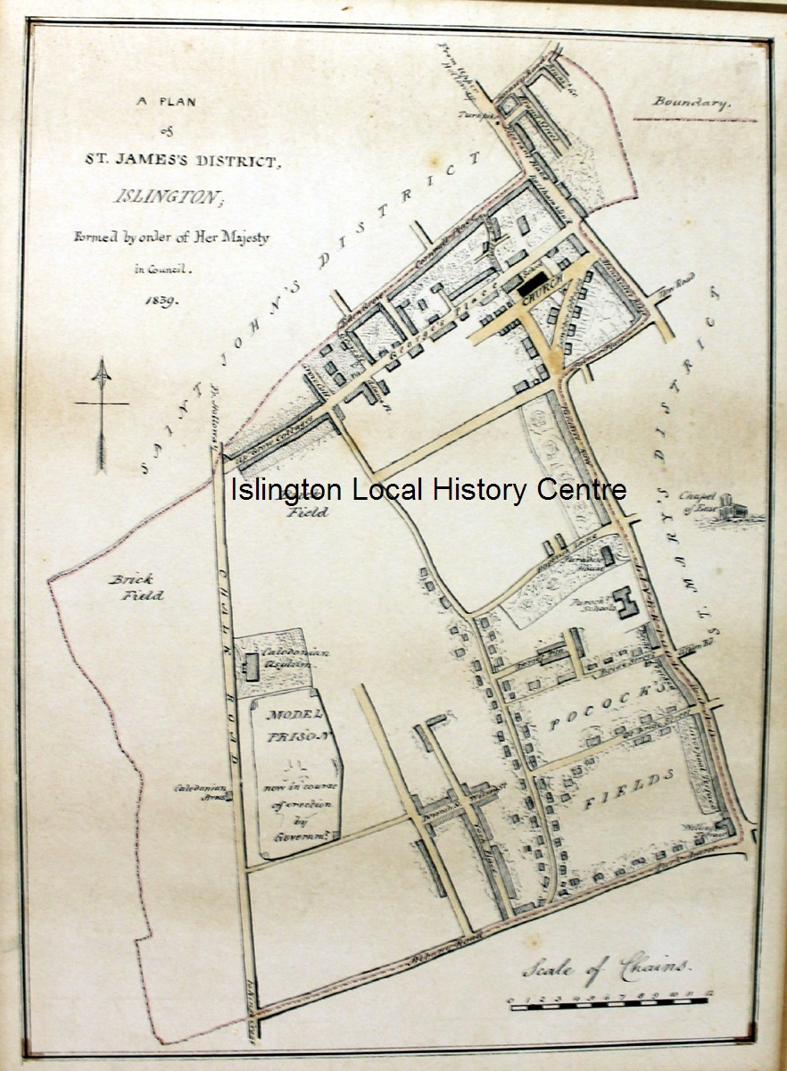 Lightly coloured map of the parish of St James from Chalk (later Caledonian) Road where the model prison is under construction among the brickfields, to Liverpool Road.