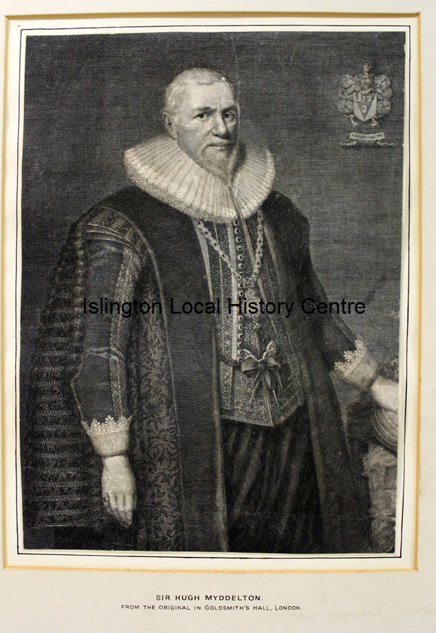Sir Hugh Myddelton, Knight & Baronet in chain of office and with Coat of Arms.
