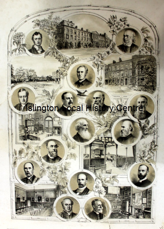 Seven engravings of the exterior and main rooms of the building with 15 portrait heads of associated bishops and clergy. The Church Missionary Society (CMS) College opened on Upper Street in 1826 for “the education and preparation of missionary students for missionary labours” and closed in 1915 (Sutton Dwellings now occupy the site). This print looks as if it commemorates the building and its staff around the time of its closure.