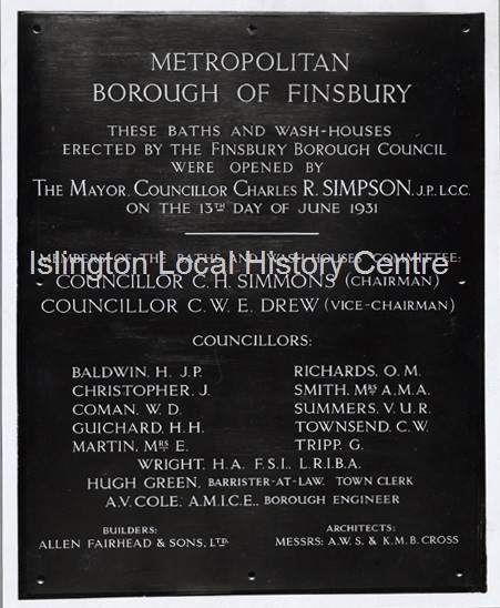 Commemorative plaque for Mayoral opening of Ironmonger Row Baths in 1931