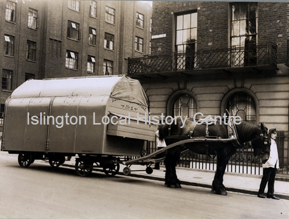 Covered horse-drawn dustcart (Borough of Finsbury No 5) with cart horse and driver, on Wilmington Square