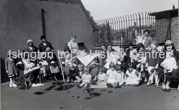 Large group of mothers, children, babies and staff photographed on the roof of Leage Street Welfare Centre, Bath Street.