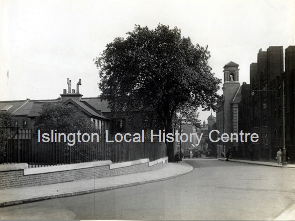 New railings along the New River Company in a deserted Amwell Street, opposite the newly built (1928-30) Charles Rowan Police Flats for married police.