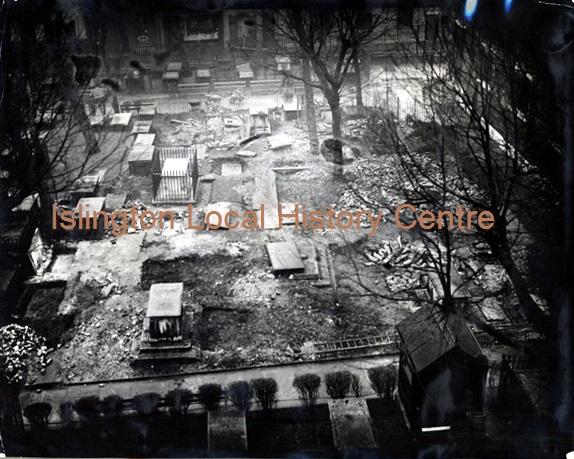 Aerial view of partly demolished tomb stones in the graveyard of St Luke's Church (to make way for Ironmonger Row Baths?)