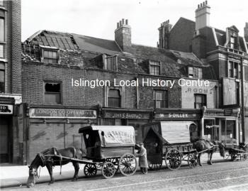 Photograph showing horse-drawn vehicles and workers outside run-down shops/businesses in Essex Road, Islington