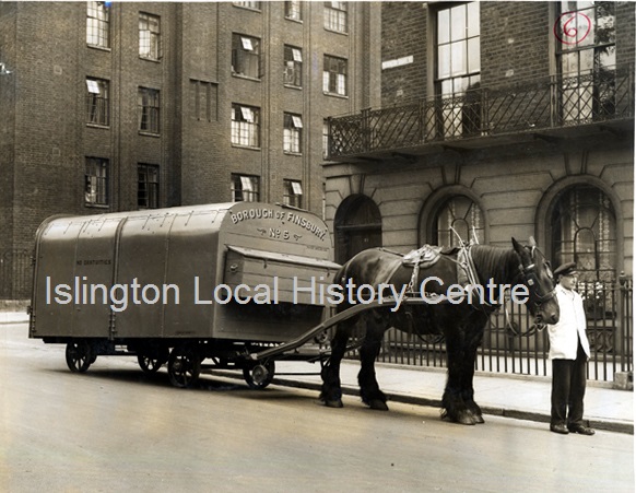 Horse-drawn container (Borough of Finsbury No 5) loaded ready for collection by motor, with cart horse and driver, on Wilmington Square