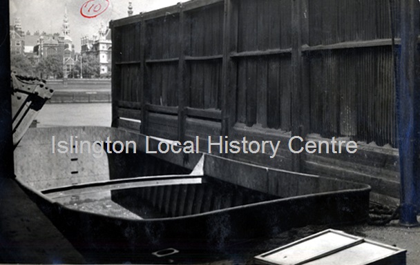 Ordinary barge ready for loading refuse on River Thames, with a screen at the side.