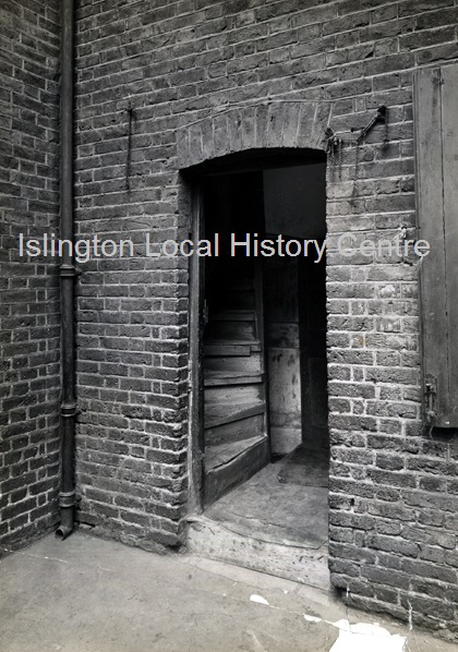 19 Whitehorse Alley, Cowcross Street - entrance and stairs to first floor, photographed as part of a survey of the area before demolition.