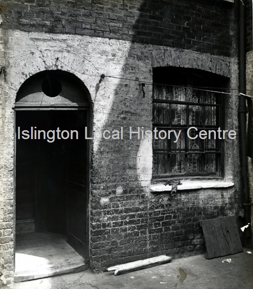8 Pump Court off Whitehorse Alley, Cowcross Street - front entrance and window showing settlement of cracks, photographed as part of a survey of the area before demolition.